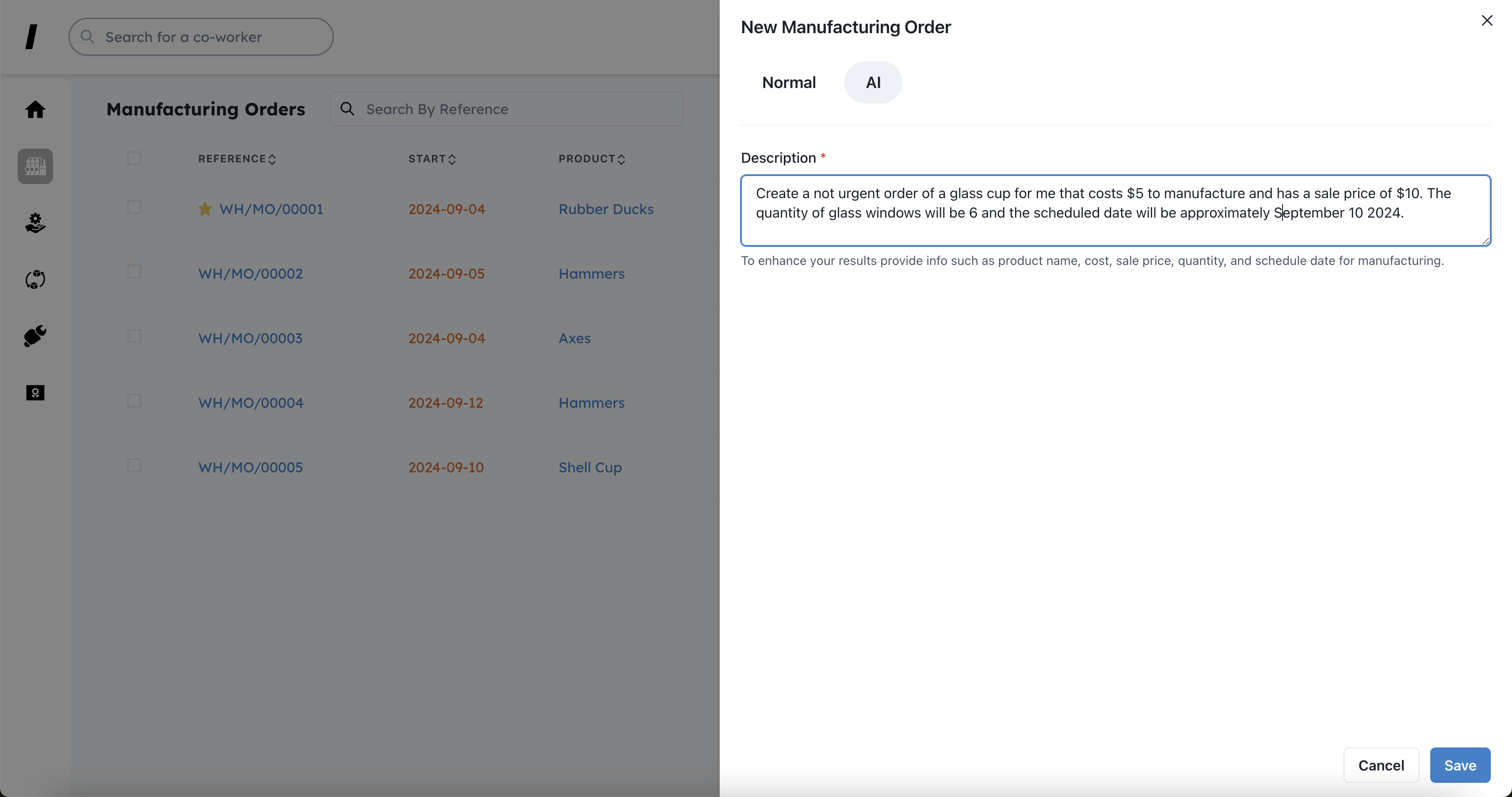 You can use AI to faster created manufacturing orders. It now only takes seconds to create manufacturing orders.