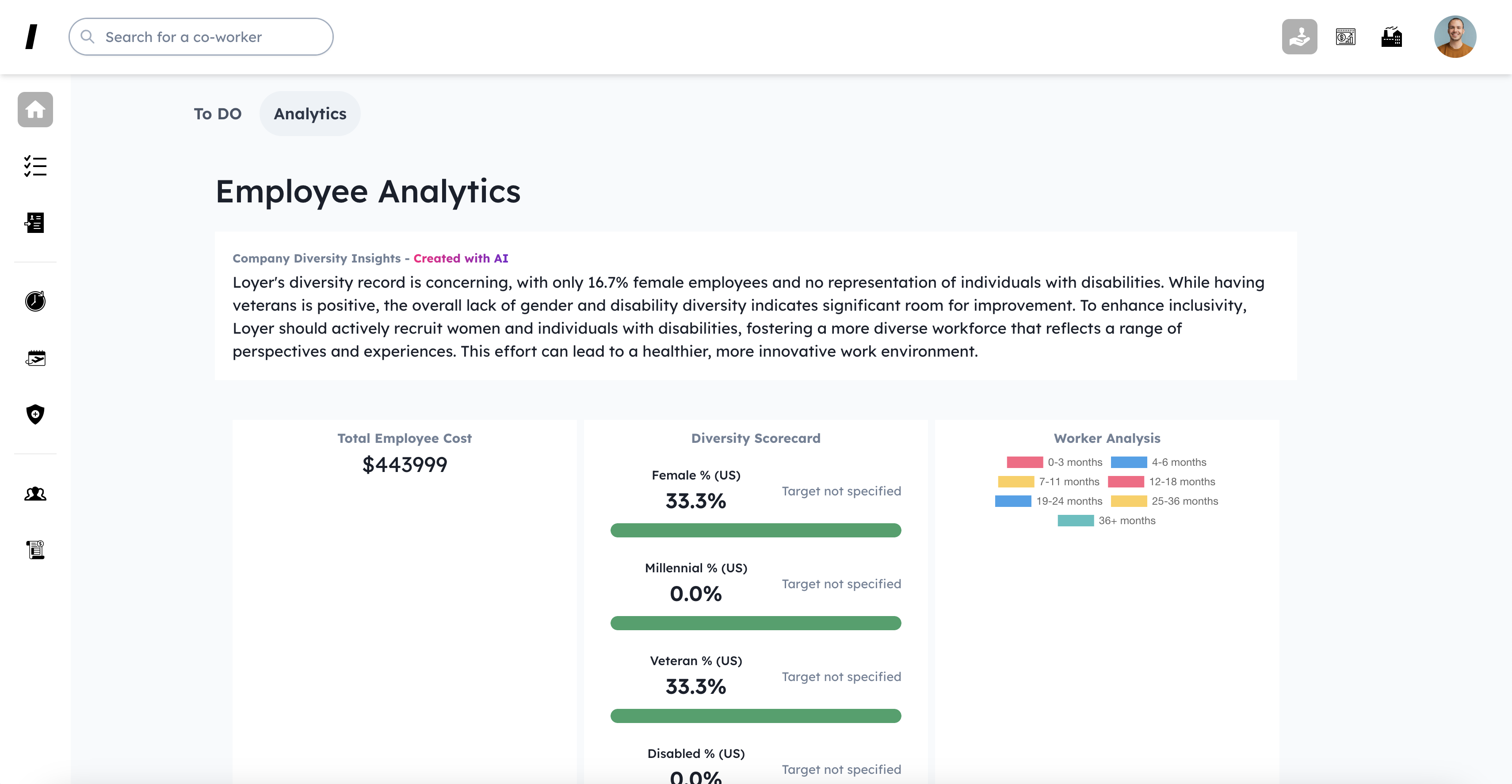 Use our AI diversity report, simple onboarding/offboarding, employee tasks, time off, employees, benefits, and employee analytics.