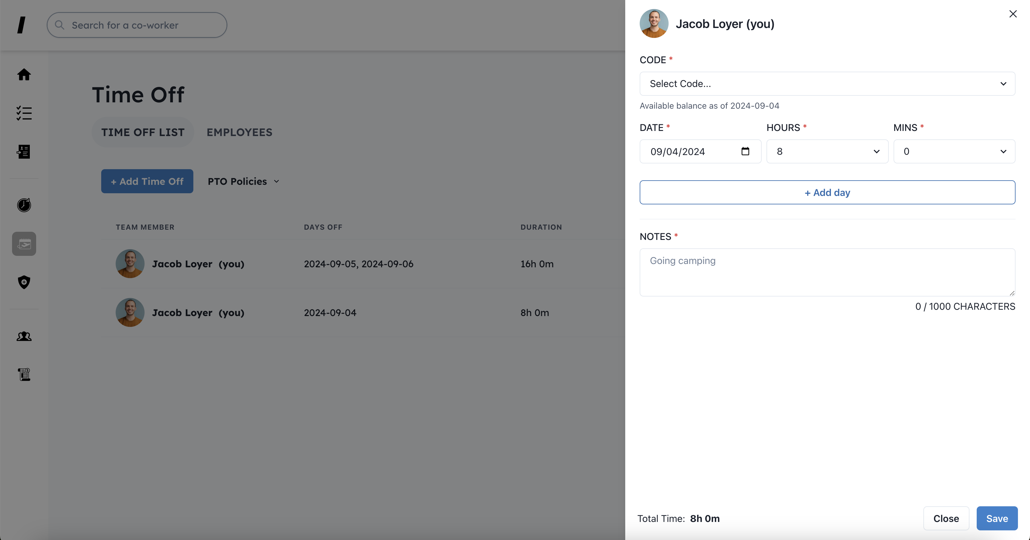 Curate customizable time off policies, set time off requests, accept time off requests as manager, and store all of the data into payroll calculations.